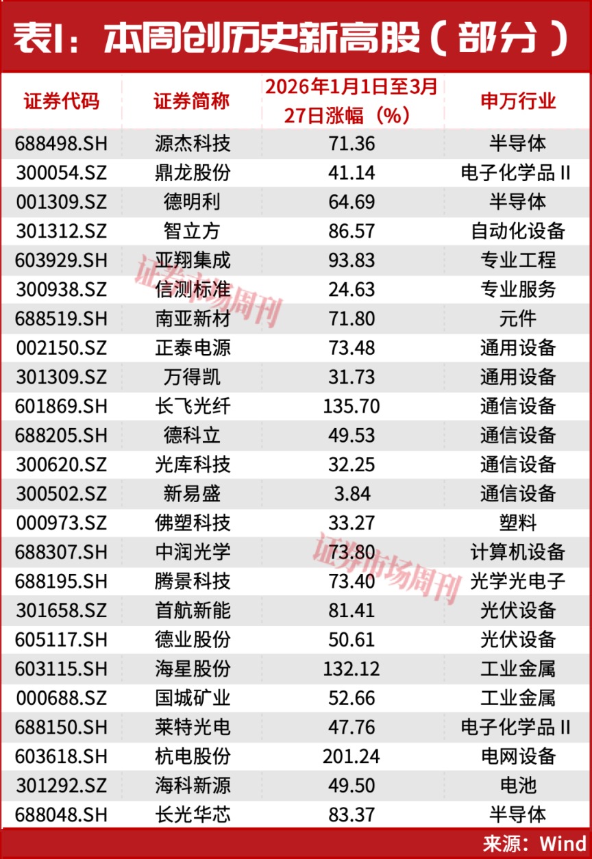 慢牛且创新高个股批量出现。除了上述提及的源杰科技、德明利、鼎龙股份等,这周还有其他一众个股创出新高,如德科立、南亚新材、新易盛等,它们以AI算力硬件、光通信、半导体等个股居多(见表1)。