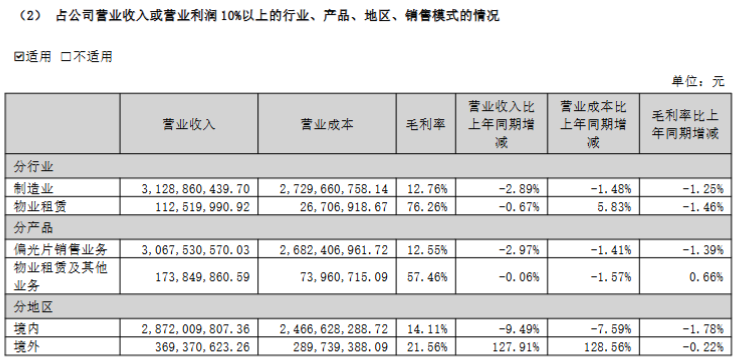 公司在年报中指出,由于偏光片市场竞争加剧,以及公司产线设备制程能力受限,导致部分高端 OLED 偏光片订单获取不足,偏光片销售总体呈现“量增价减”态势。直接导致偏光片毛利率下降1.39%,成为利润下滑的主因。