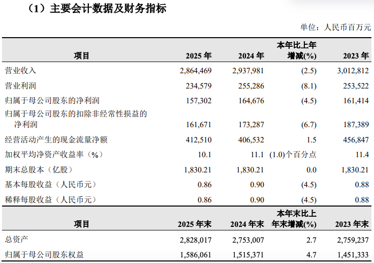 尽管2025年业绩同比下滑,但公司分红预案依然慷慨,2025年公司拟向全体股东每股派发现金红利0.25元(含税),合计拟派发现金红利457.55亿元(含税)。