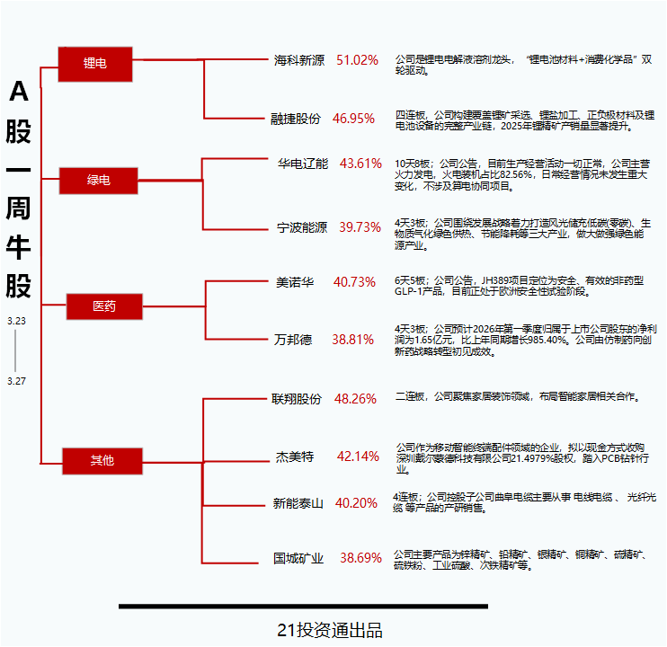 本期牛股榜中(剔除近一月上市的次新股,下同),多只锂电、绿电概念股涨幅领先。其中,海科新源(301292.SZ)单周大涨超51%,股价创历史新高,成为本期的最牛股。联翔股份(603272.SH)过去一周涨超48%,排名第二。此外,融捷股份(002192.SZ)、华电辽能(600396.SH)、杰美特(300868.SZ)等多只牛股涨幅均在40%以上。