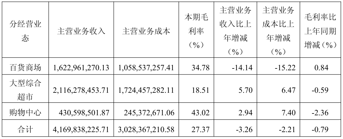 分经营业态来看,报告期内,作为核心支柱的百货业务正在萎缩,主营收入16.23亿元,同比缩减14.14%;而大型综合超市虽然营收增长5.70%至21.16亿元,却陷入了“增收不增利”的困局,毛利率仅为18.51%,且同比下降0.59%。