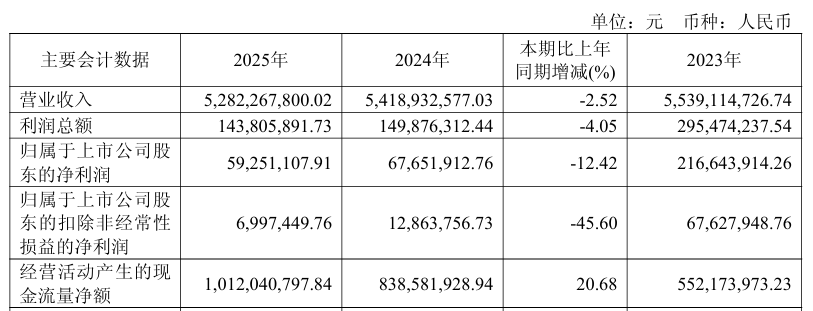 3月28日,银座股份(SH600858)发布2025年年报。数据显示,2025年银座股份实现营业收入52.82亿元,同比下降2.52%;归母净利润为5925.11万元,同比下滑12.42%。