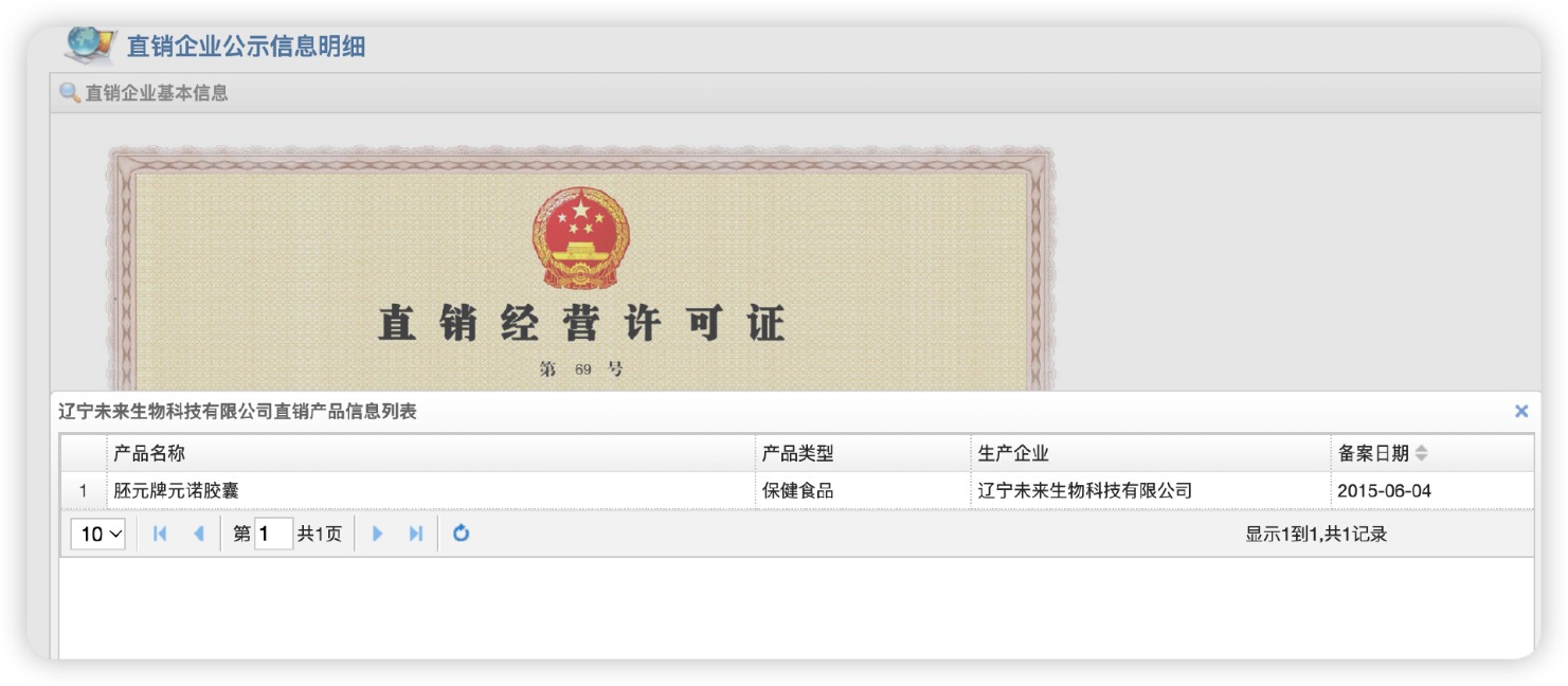 此外,蓝鲸新闻记者注意到,根据商务部直销行业管理网站公示信息,未来生物于2015年获批直销经营许可,但获准直销的产品仅有一款保健食品——胚元牌元诺胶囊。