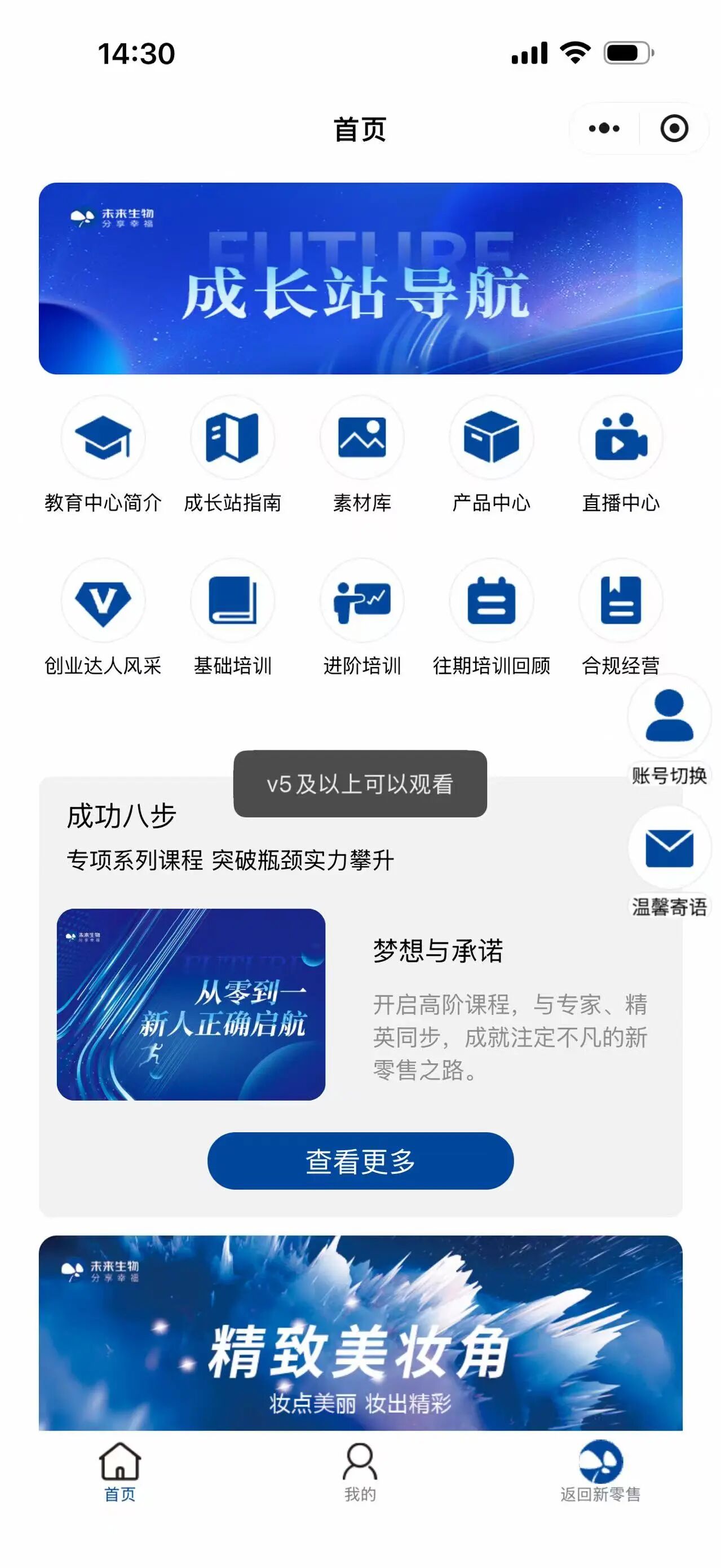蓝鲸新闻记者在“未来生物”公众号中看到一份《双月课程计划》,时间跨度为2026年2月11日至4月10日。这张课程表密密麻麻排满了各类线上活动。但当记者进入小程序想要观看“进阶培训”时,却被告知“V5及以上可以观看”。
