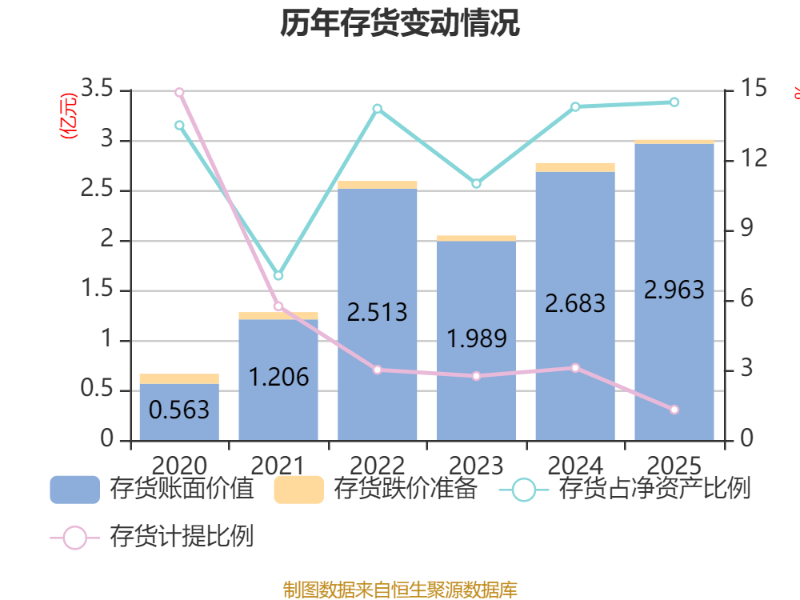 从存货变动来看,截至2025年末,公司存货账面价值为2.96亿元,占净资产的14.48%,较上年末增加2801.35万元。其中,存货跌价准备为390.67万元,计提比例为1.3%。