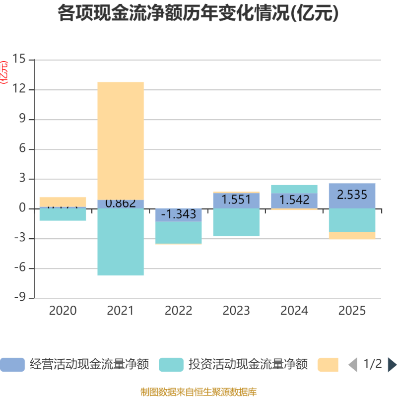 截至2025年,公司经营活动现金流净额为2.54亿元,同比增长64.45%;筹资活动现金流净额-7196.25万元,同比减少5599.63万元;投资活动现金流净额-2.4亿元,上年同期为8202.53万元。