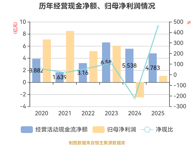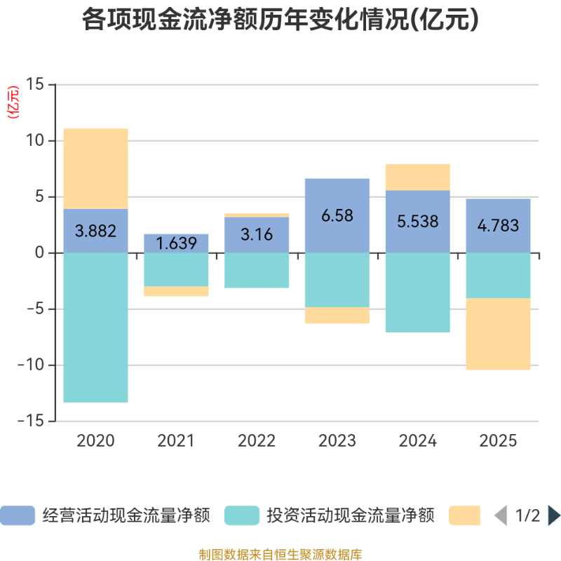 截至2025年,公司经营活动现金流净额为4.78亿元,同比下降13.63%;筹资活动现金流净额-6.39亿元,同比减少8.72亿元;投资活动现金流净额-4.08亿元,上年同期为-7.13亿元。