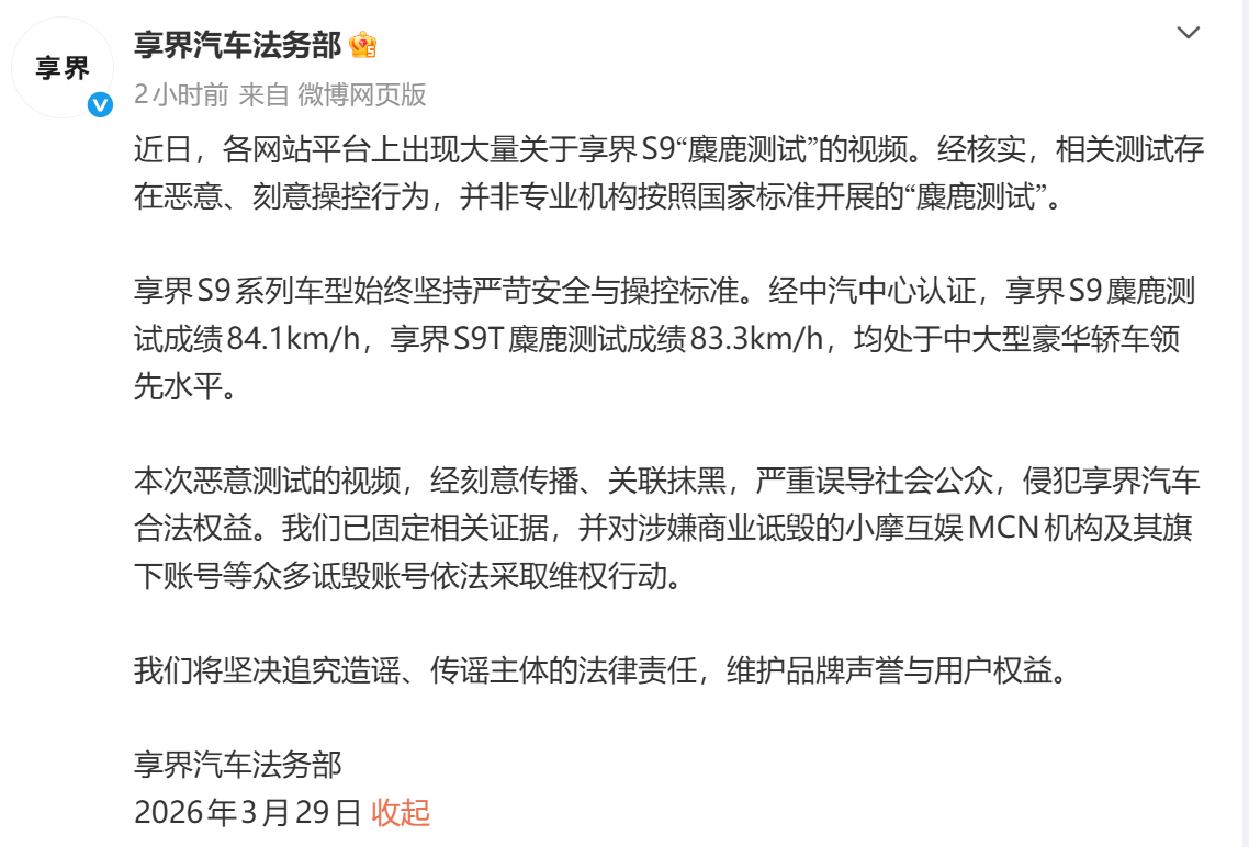 每经AI快讯,3月29日,享界汽车法务部发文称,近日,各网站平台上出现大量关于享界S9“麋鹿测试”的视频。经核实,相关测试存在恶意、刻意操控行为,并非专业机构按照国家标准开展的“麋鹿测试”。享界S9系列车型始终坚持严苛安全与操控标准。经中汽中心认证,享界S9麋鹿测试成绩84.1km/h,享界S9T麋鹿测试成绩83.3km/h,均处于中大型豪华轿车领先水平。本次恶意测试的视频,经刻意传播、关联抹黑,严重误导社会公众,侵犯享界汽车合法权益。我们已固定相关证据,并对涉嫌商业诋毁的小摩互娱MCN机构及其旗下账号等众多诋毁账号依法采取维权行动。我们将坚决追究造谣、传谣主体的法律责任,维护品牌声誉与用户权益。