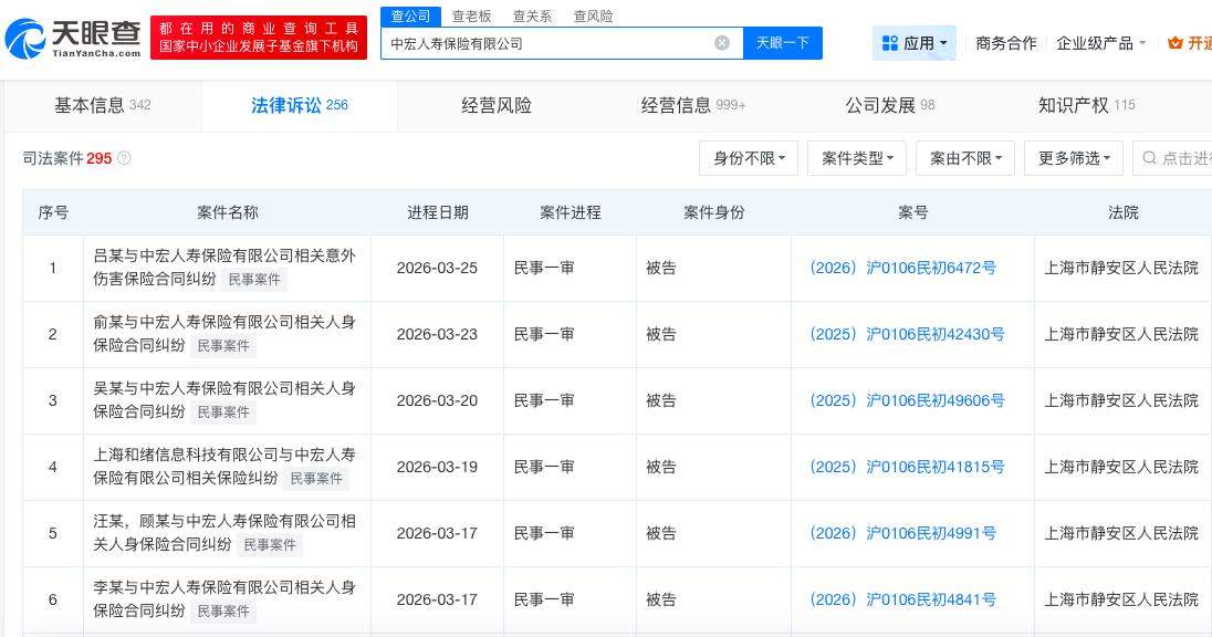 读创财经注意到,天眼查数据显示,2025年以来中宏人寿作为被告涉案已达30多起。