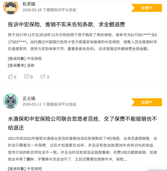 近日,在黑猫投诉平台,有两条投诉信息均与中宏保险有关,消费者投诉直指销售人员存在虚假宣传,要求中宏保险退还保费。