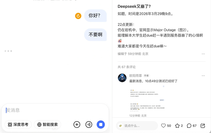 随着用户反馈持续发酵,DeepSeek官方账号评论区也出现更多连锁反应。有用户提到,在网络卡顿过程中误删了尚未保存的文本内容,也有人在进行论文修改、补充引用时被迫中断操作。个别用户还晒出系统卡顿前的对话截图,表达对服务中断的不满。这类讨论在短时间内集中出现,也显示出突发故障对高频使用用户的直接影响。