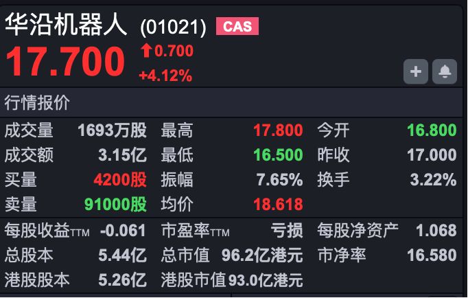 另一只新股华沿机器人(HK01021)早盘一度破发,但随后股价回升,截至发稿,涨幅超过4%。