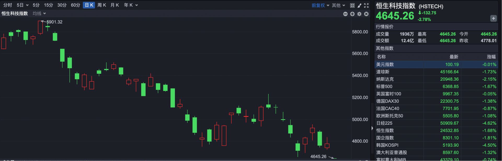 恒生科技指数开盘报4645.26点,下跌132.75点,跌幅2.78%。