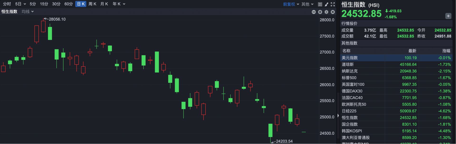 截至发稿,恒生指数开盘报24532.85点,下跌419.03点,跌幅1.68%。