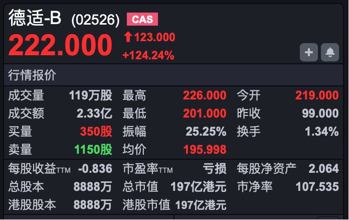 其中,德适-B(HK02526)上市首日实现翻倍,早盘高开超121%,开盘后股价涨幅扩大至124%。