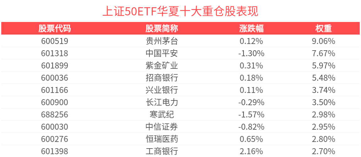 上证50ETF华夏紧密跟踪上证50指数,截至2026年2月27日,指数前十大权重股分别为贵州茅台、中国平安、紫金矿业、招商银行、长江电力、兴业银行、中信证券、恒瑞医药、寒武纪、海光信息,前十大权重股合计占比46.55%。