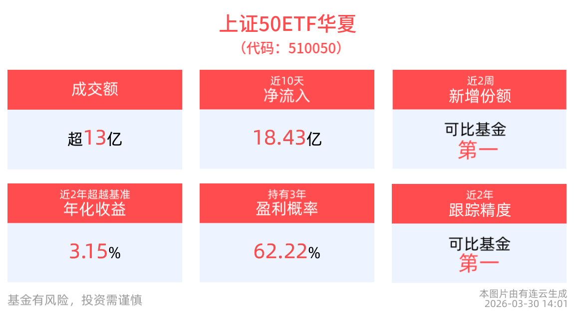 统计显示,上证50ETF华夏(510050)近10个交易日内有6日资金净流入,合计“吸金”18.43亿元,截至3月27日,最新规模达682.14亿元,居可比基金首位。