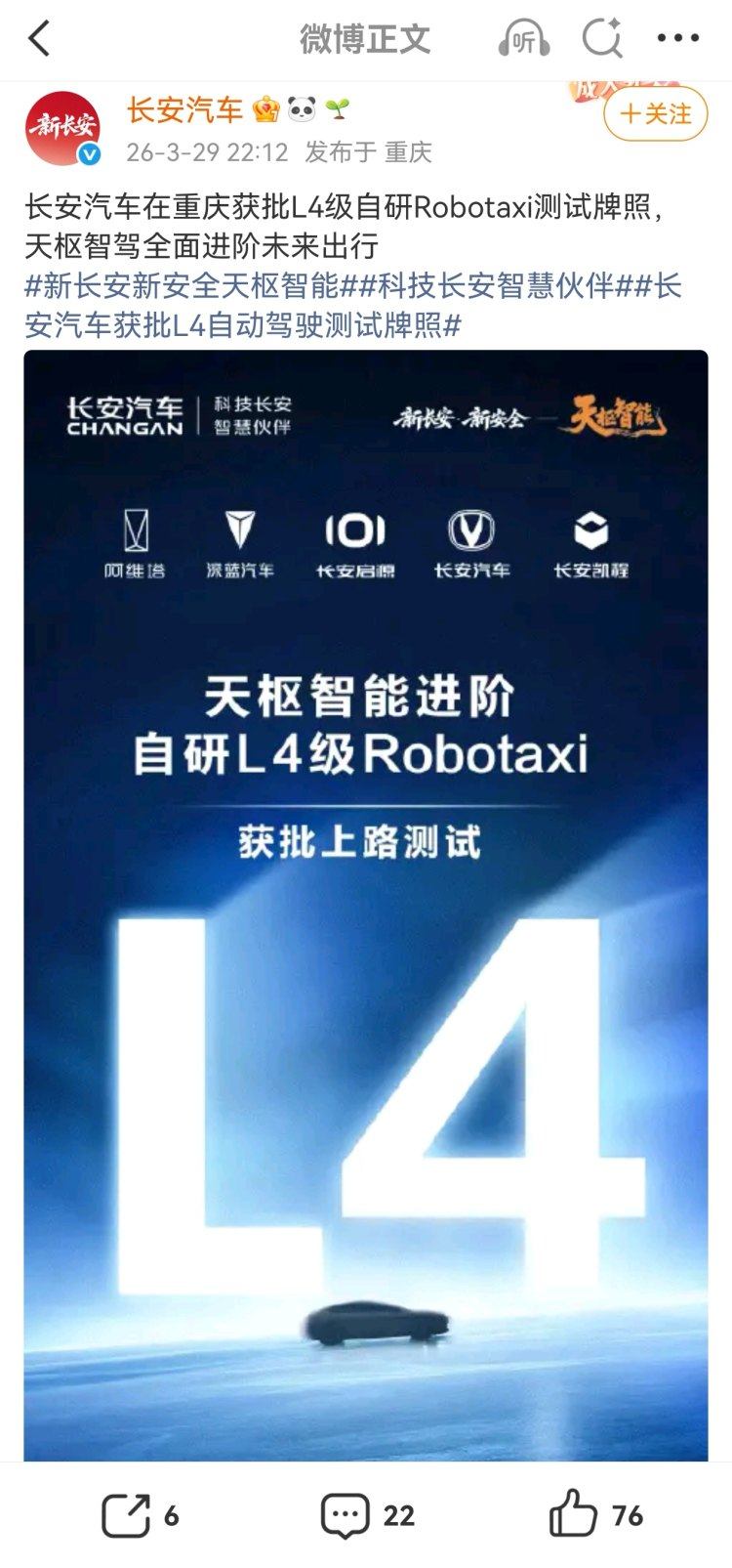 3月29日,长安汽车官宣在重庆获批L4级自研Robotaxi测试牌照,依托“天枢智能”技术体系正式开启高阶无人驾驶出租车道路实测。