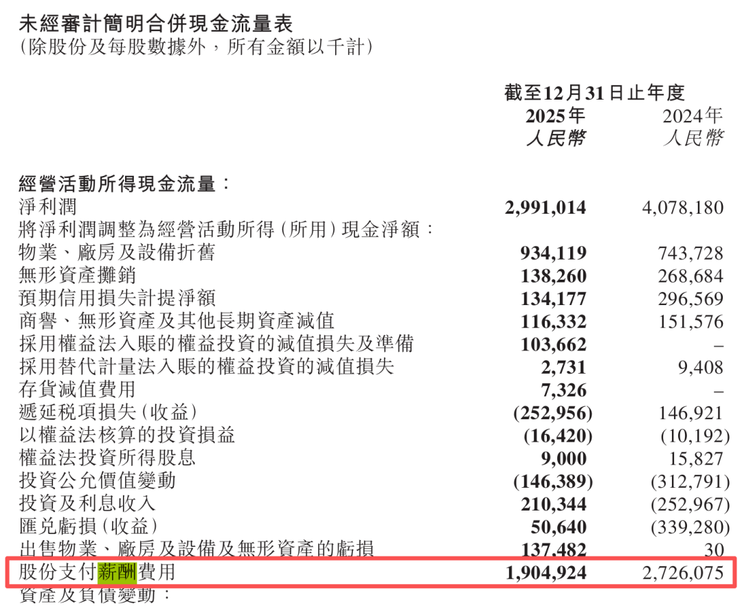 值得注意的是,财报显示,公司2025年股份支付薪酬费用为19.04亿元,较2024年的27.26亿元有所回落。