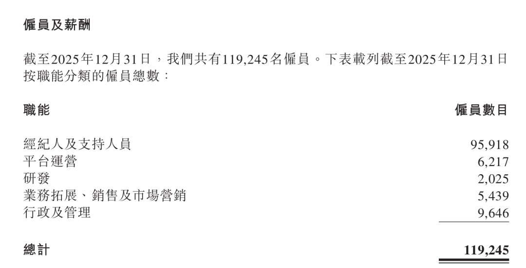 根据年报披露的数据,截至2025年末,贝壳雇员总数11.92万人,较2024年底的13.51万人净减少1.58万人,降幅12%。其中,经纪人及支持人员从10.65万人减少至9.59万人。