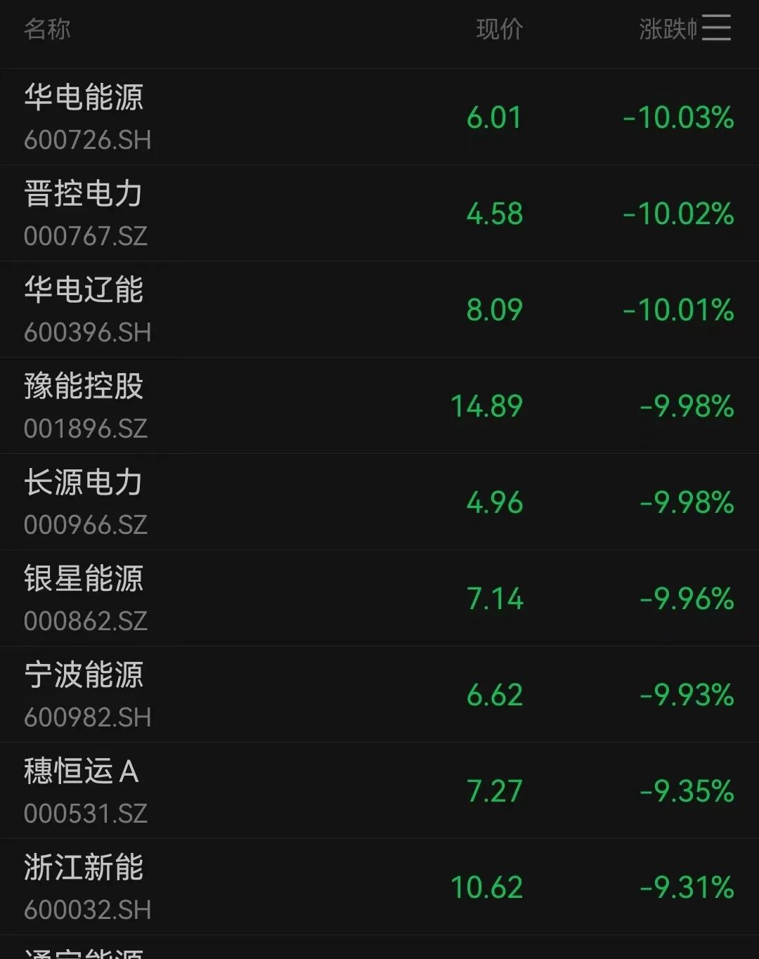下跌方面,电力股大幅下挫,华电能源、晋控电力、豫能控股跌停。