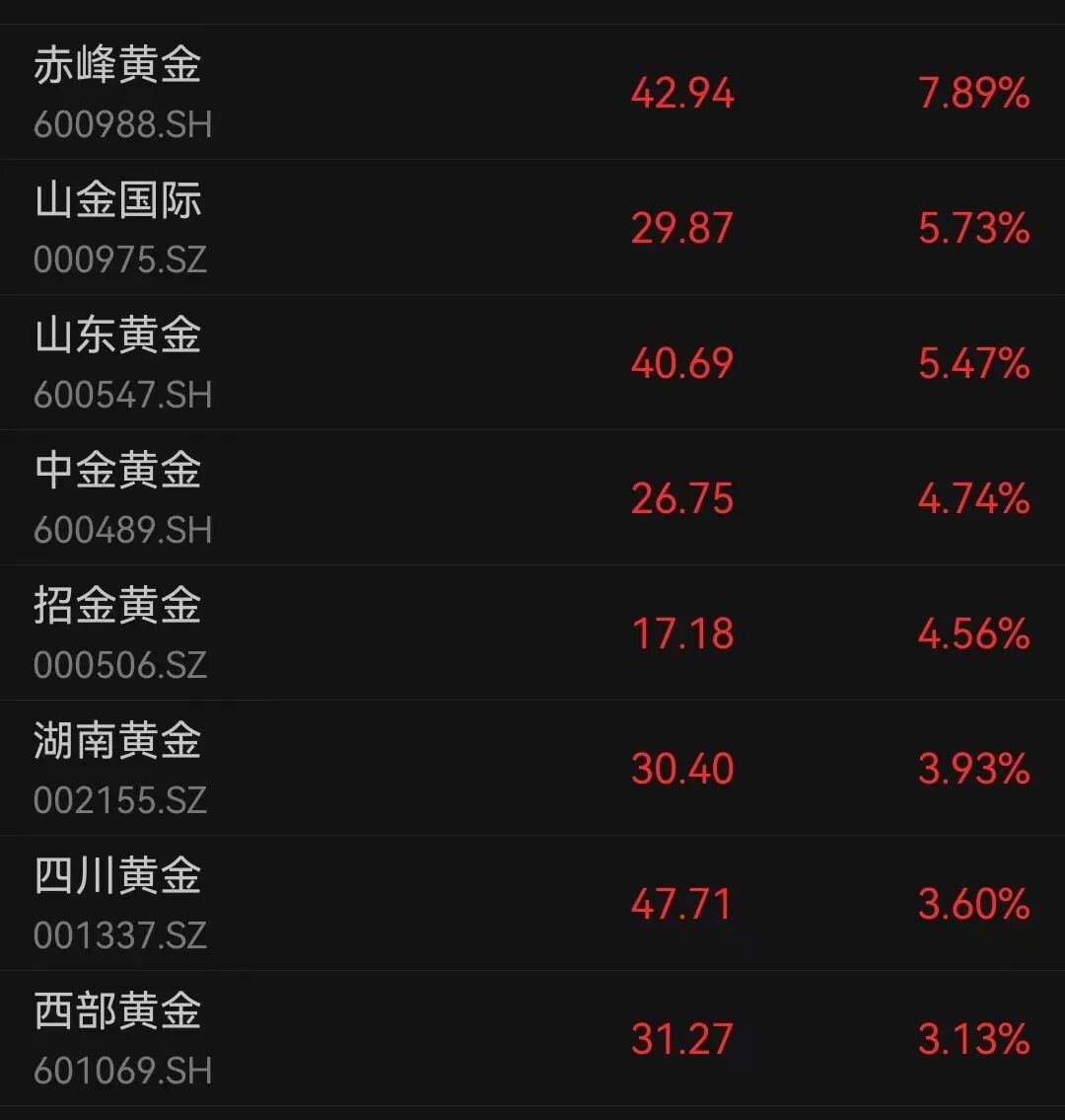 黄金股拉升,赤峰黄金涨超7%,山东黄金涨超5%,中金黄金涨超4%,湖南黄金、四川黄金、西部黄金涨超3%。
