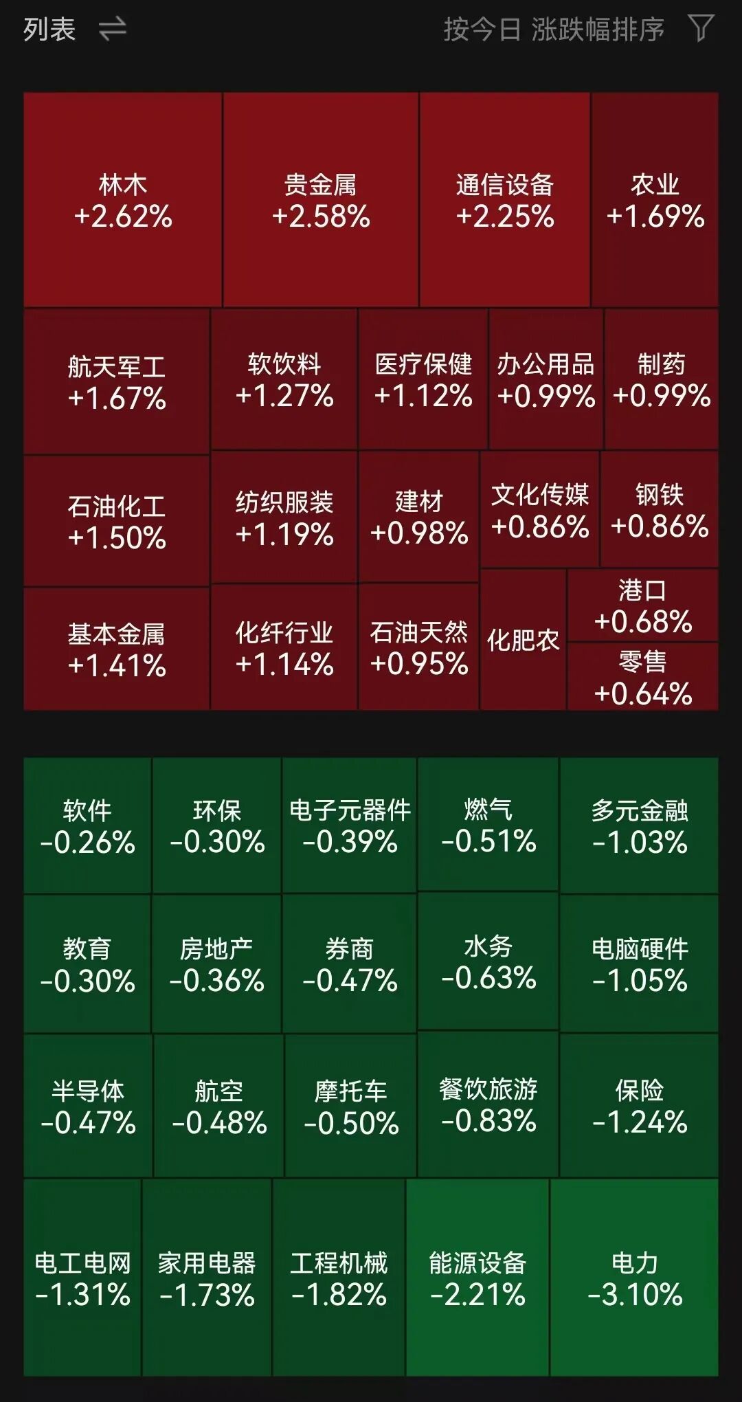 板块方面,林木、贵金属、通讯设备股涨幅居前;电力、能源设备、工程机械股跌幅居前。