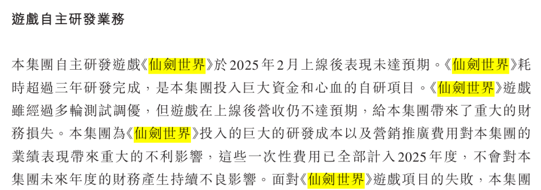 对于业绩下滑的核心原因,中手游将理由指向自主研发游戏《仙剑世界》的失败。据公告披露,《仙剑世界》耗时超过三年研发完成,是中手游投入巨大资金和心血的自研项目,虽经过多轮测试调优,但游戏在上线后营收仍不达预期,给本集团带来了重大的财务损失。