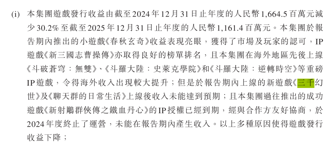 公告显示,2025年中手游国内市场推出的《三千幻世》和《聊天群的日常生活》两款手游,均未达到预期业绩,其中《三千幻世》付费用户转化效率较低,《聊天群的日常生活》经多轮版本更新调优后,数据表现仍未达标。尽管同期《春秋玄奇》《新三国志曹操传》《火影忍者:木叶高手》等产品表现亮眼,但仍未能抵消亏损项目带来的冲击。