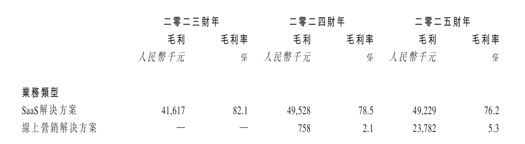 值得注意的是,招股书显示,随手播SaaS解决方案毛利率呈下滑趋势,2023财年至2025财年分别为82.1%、78.5%、76.2%。公司线上营销解决方案毛利虽明显增长,但毛利率较低,2024年、2025年分别为2.1%、5.3%。
