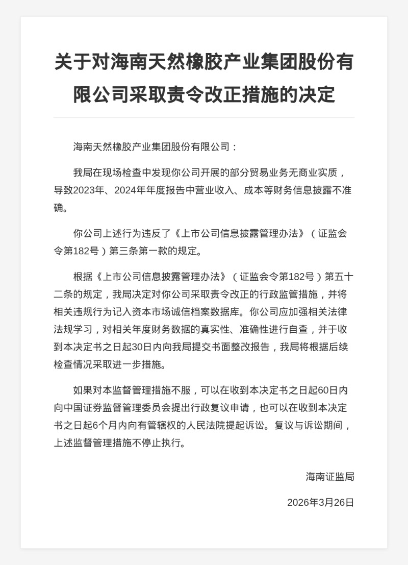 原标题:海南天然橡胶集团被责令改正,涉信息披露不准确