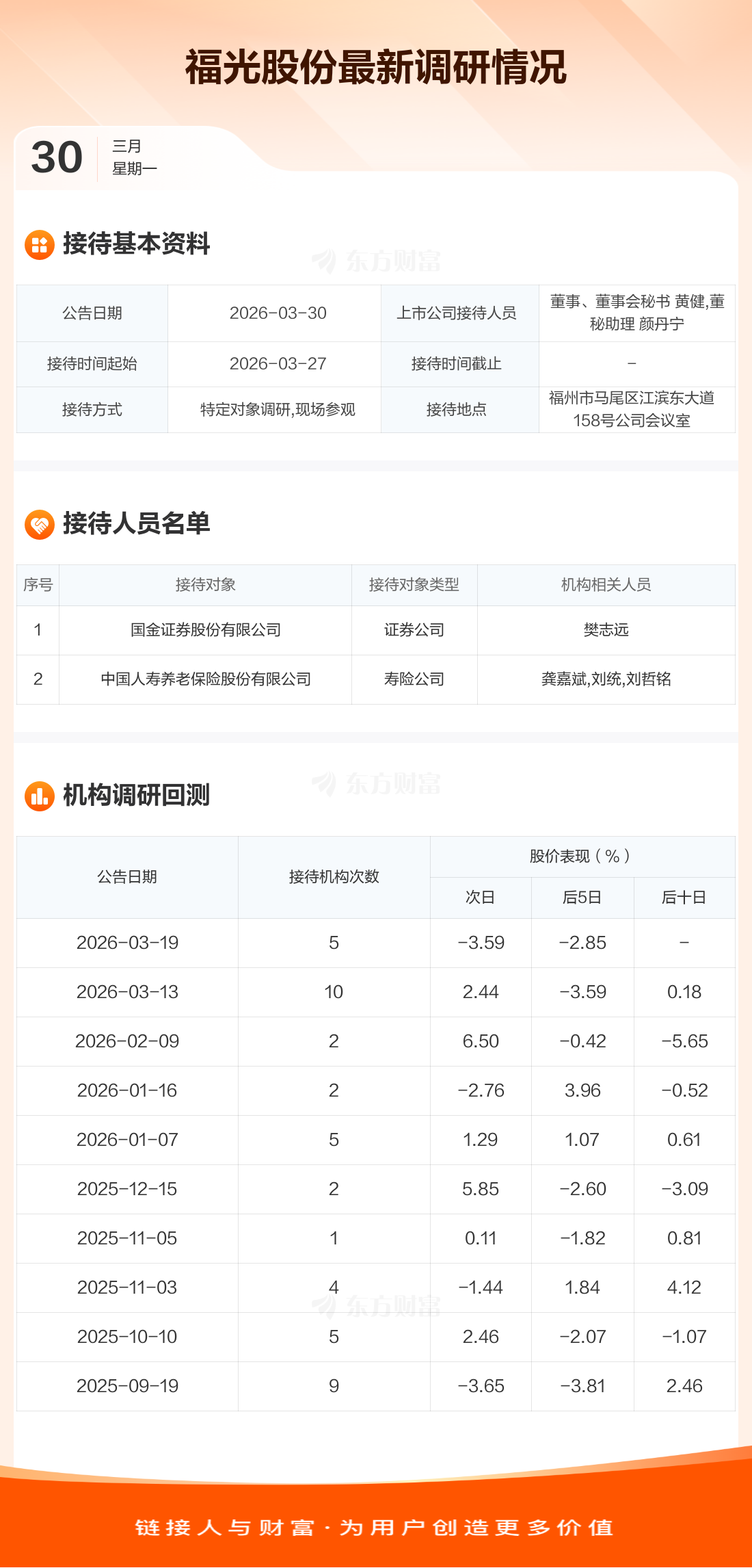 福光股份3月30日公告称,3月27日接待国金证券股份有限公司等2家机构调研。接待人员包括董事、董事会秘书 黄健,董秘助理 颜丹宁。