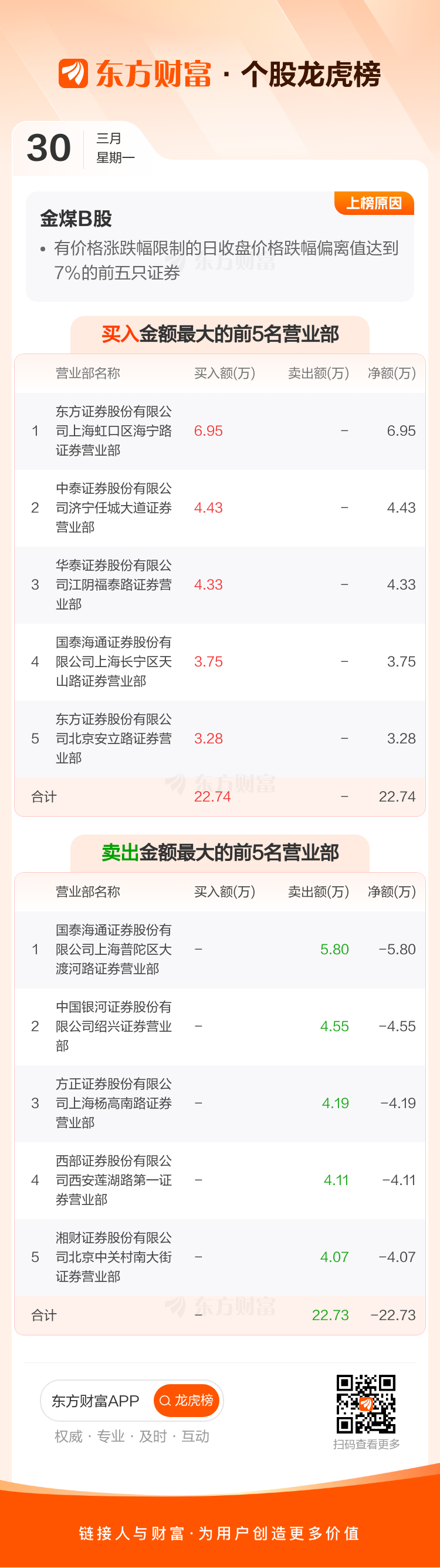 交易所2026年3月30日公布的交易公开信息显示,金煤B股因成为有价格涨跌幅限制的日收盘价格跌幅偏离值达到7%的前五只证券上榜。金煤B股当日收报0.2元,涨跌幅-8.26%,偏离值-8.51%,换手率3.39%,成交额140.25万。