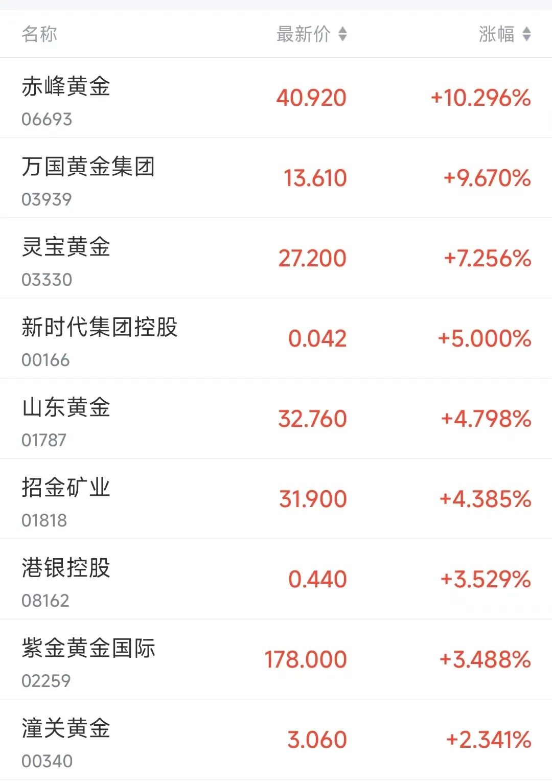 黄金板块上涨,赤峰黄金涨超10%,万国黄金集团涨超9%,灵宝黄金涨超7%。