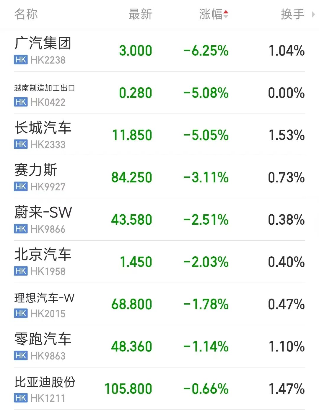 汽车板块下挫,广汽集团跌超6%,长城汽车跌超5%,小鹏汽车跌超4%。