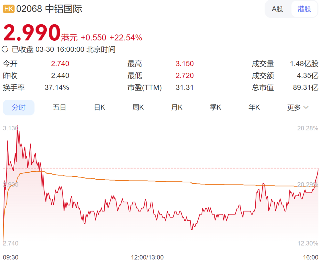 铝业股领涨,中铝国际涨超22%,中国铝业涨超7%,南山铝业国际涨超7%,此前伊朗袭击中东铝生产设施。