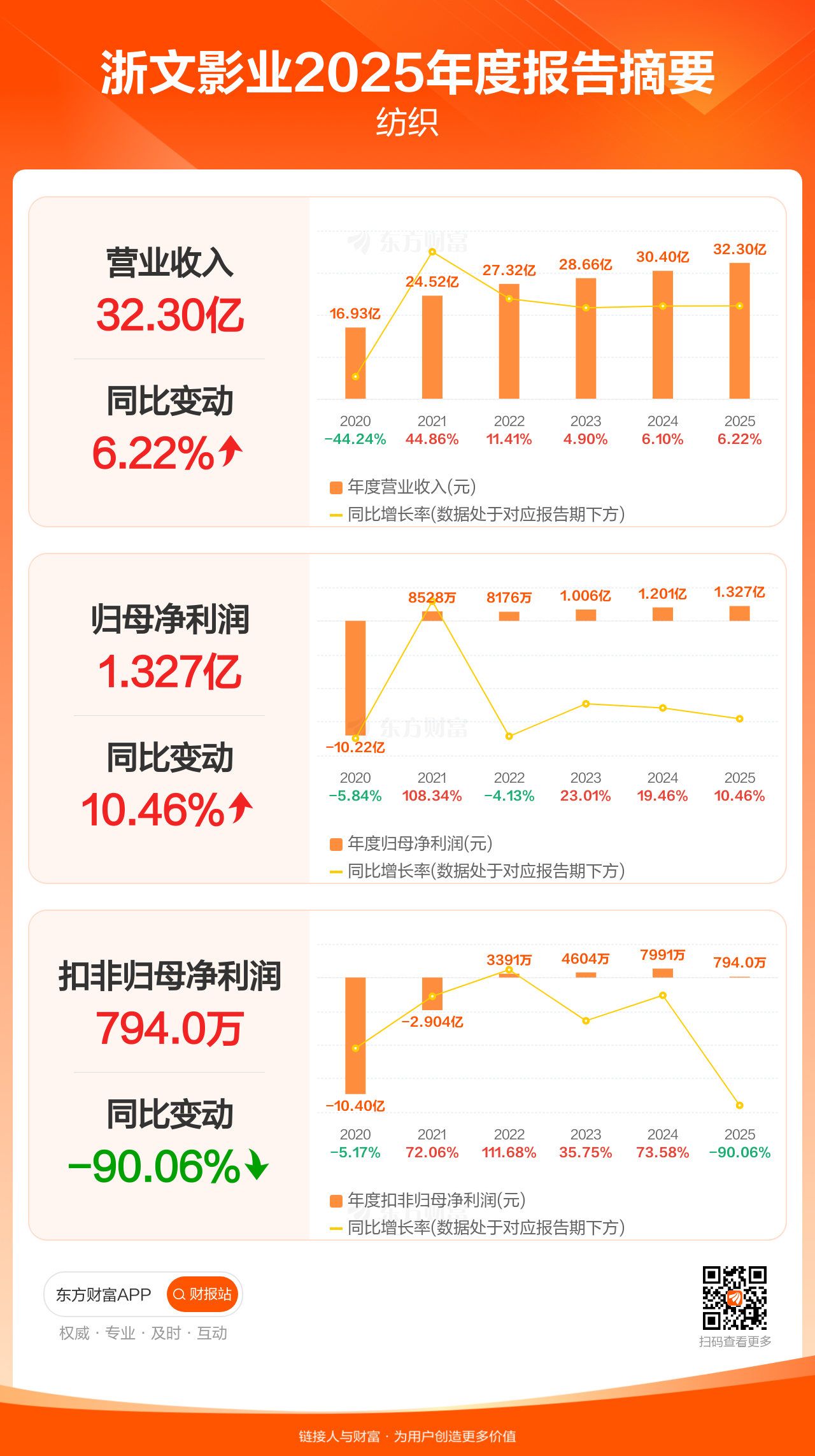 浙文影业3月31日发布2025年年报显示,公司全年实现营业收入32.30亿元,同比增长6.22%;归母净利润1.33亿元,同比增长10.46%;扣非归母净利润794.01万元,同比下滑90.06%。