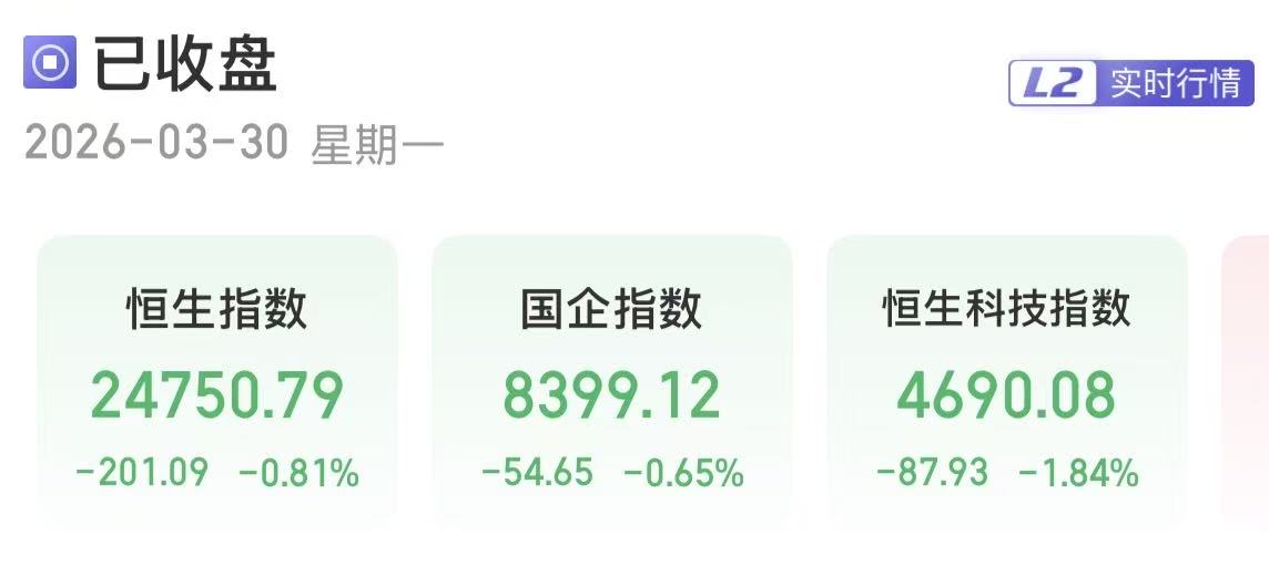 3月30日,港股三大指数收跌。截至收盘,恒生指数跌0.81%,报24750.79点;恒生国企指数跌0.65%,报8399.12点;恒生科技指数跌1.84%,报4690.08点。