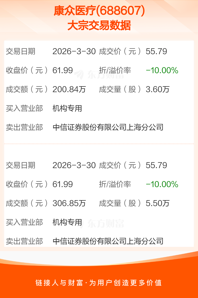 2026年3月30日,康众医疗发生2笔大宗交易,共成交9.10万股,成交金额507.69万元,占其流通市值比例为0.09%。