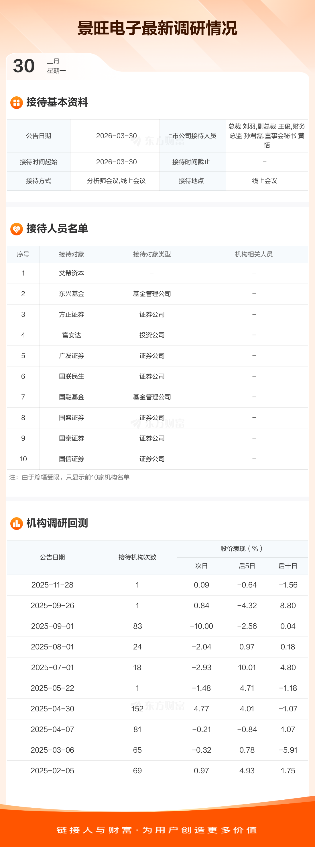 景旺电子3月30日公告称,3月30日接待艾希资本等85家机构调研。接待人员包括总裁 刘羽,副总裁 王俊,财务总监 孙君磊,董事会秘书 黄恬。