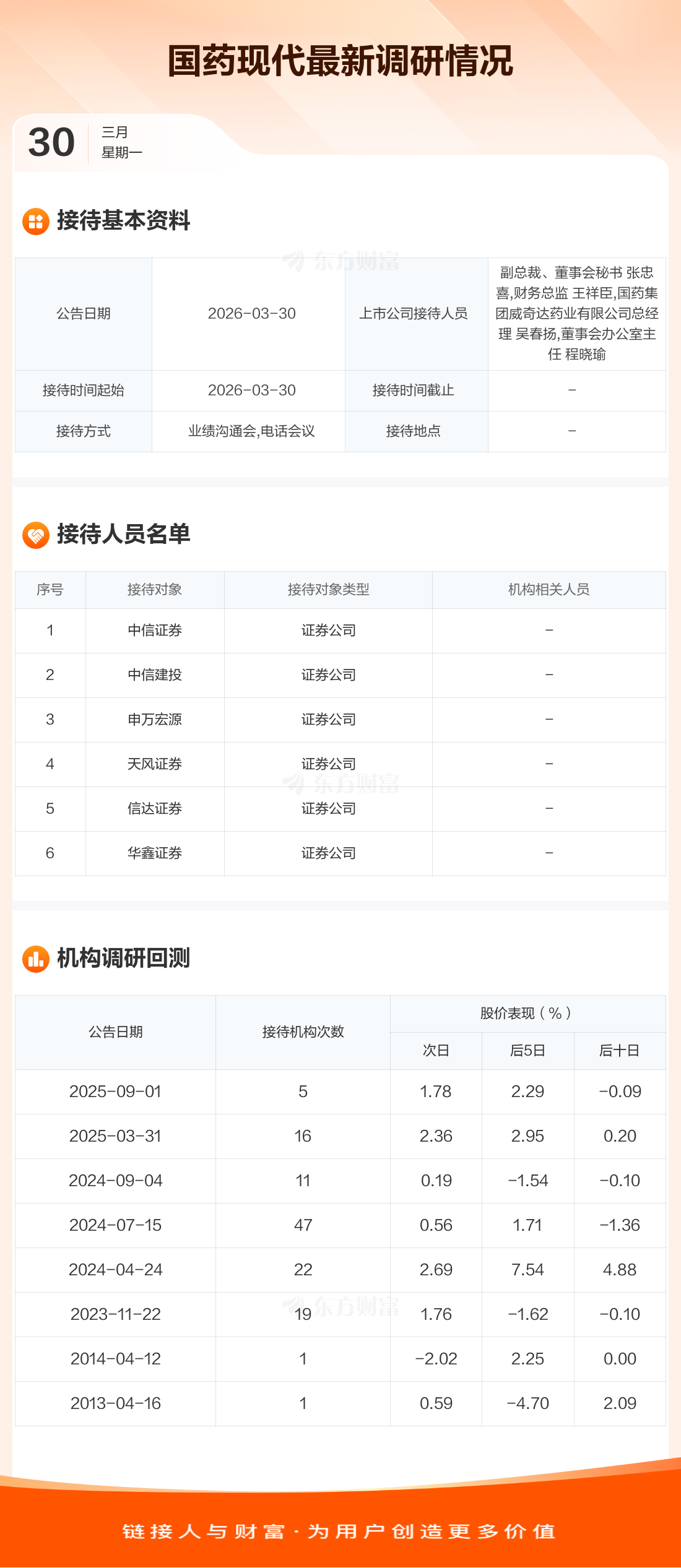 国药现代3月30日公告称,3月30日接待中信证券等6家机构调研。接待人员包括副总裁、董事会秘书 张忠喜,财务总监 王祥臣,国药集团威奇达药业有限公司总经理 吴春扬,董事会办公室主任 程晓瑜。