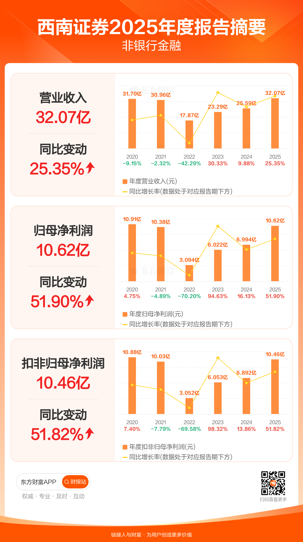 西南证券3月31日发布2025年年报显示,公司全年实现营业收入32.07亿元,同比增长25.35%;归母净利润10.62亿元,同比增长51.90%;扣非归母净利润10.46亿元,同比增长51.82%。