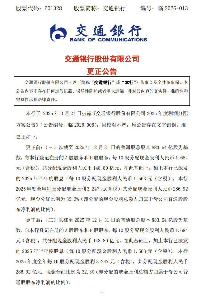 3月30日,交通银行发布更正公告:本行于2026年3月27日披露《交通银行股份有限公司2025年度利润分配方案公告》,因校对不严,原公告存在文字错误。“每股分配现金股利3.247元(含税)”,现更正为“每10股分配现金股利3.247元(含税)”。除上述更正外,其他内容无修改。本行对上述错误给投资者带来的不便深表歉意。本行将进一步加强信息披露编制与复核,确保信息披露质量。