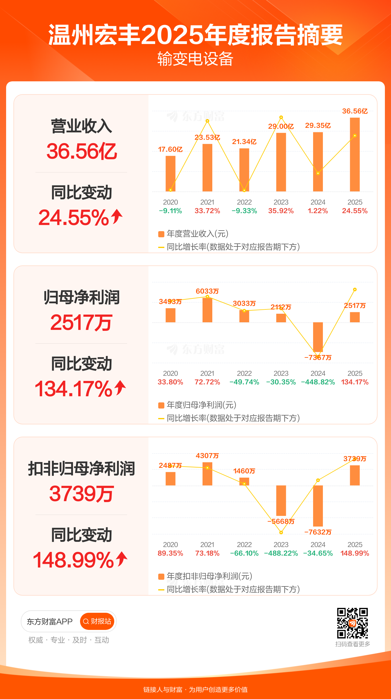 温州宏丰3月31日发布2025年年报显示,公司全年实现营业收入36.56亿元,同比增长24.55%;归母净利润2517.41万元,同比增长134.17%;扣非归母净利润3738.97万元,同比增长148.99%。
