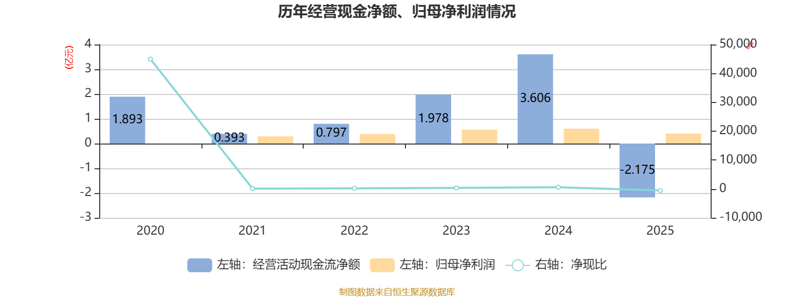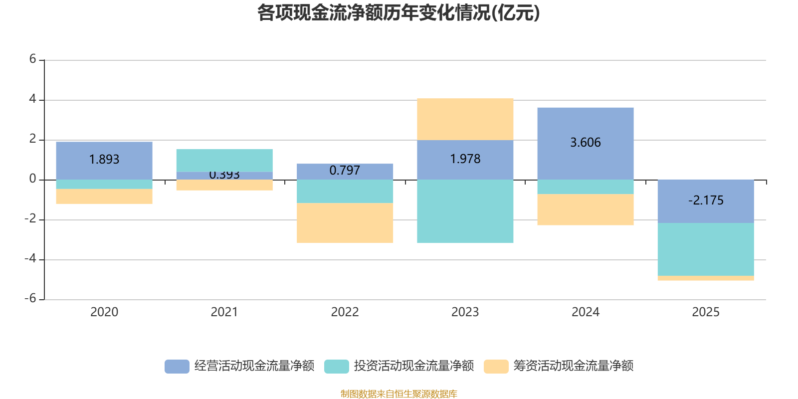 2025年,公司经营活动现金流净额为-2.17亿元,同比减少5.78亿元;筹资活动现金流净额-2391.66万元,同比增加1.32亿元;投资活动现金流净额-2.65亿元,上年同期为-7311.44万元。