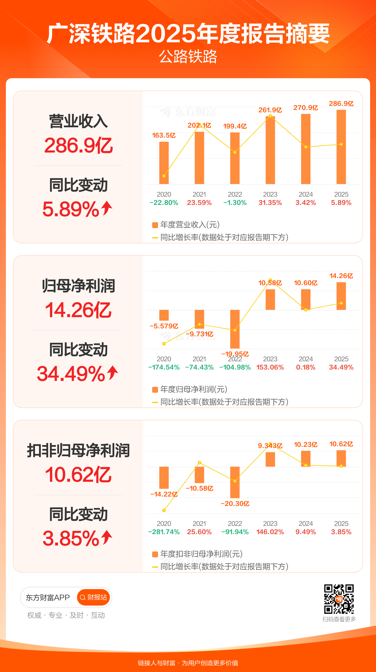 广深铁路3月31日发布2025年年报显示,公司全年实现营业收入286.86亿元,同比增长5.89%;归母净利润14.26亿元,同比增长34.49%;扣非归母净利润10.62亿元,同比增长3.85%。