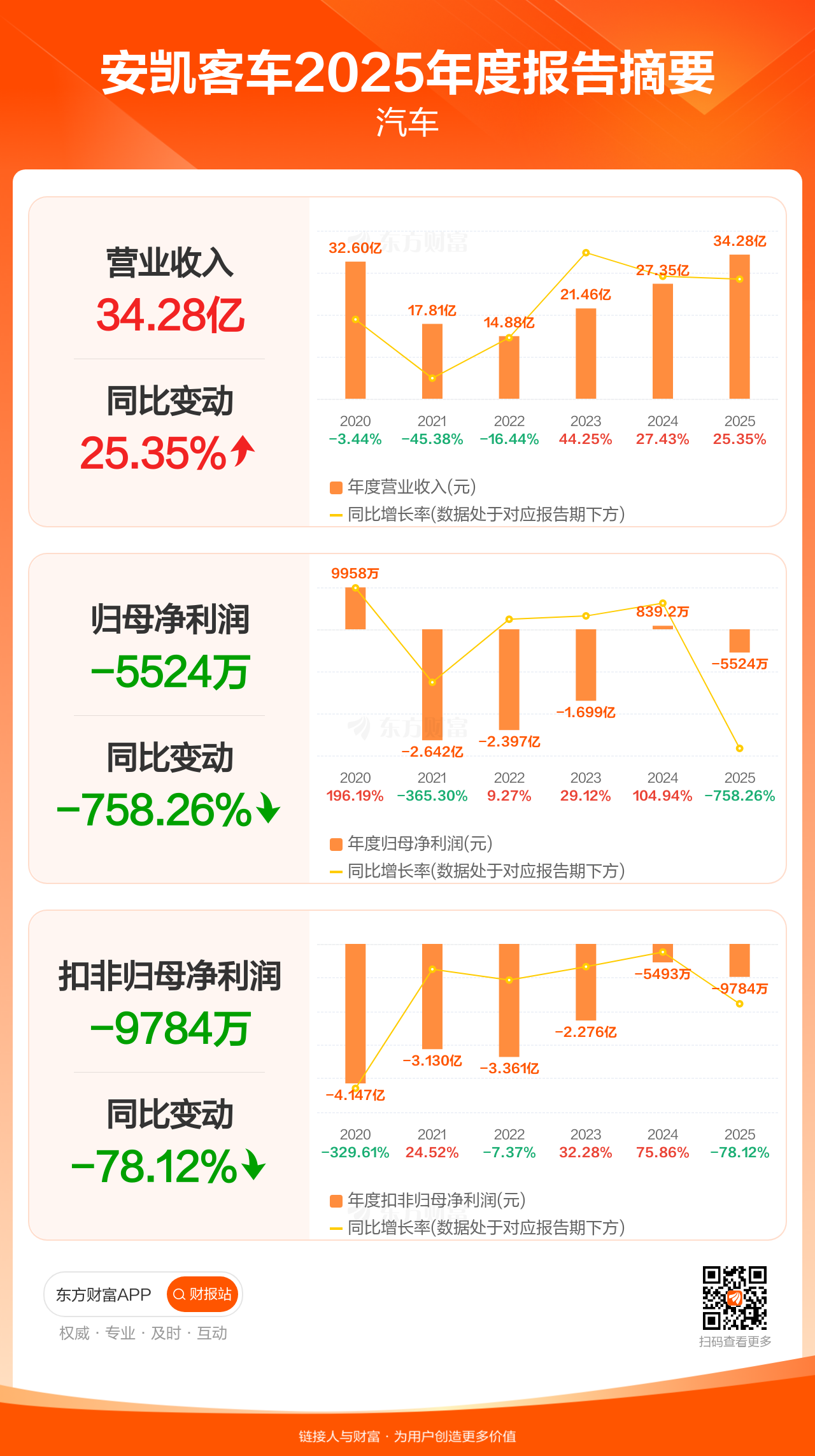 安凯客车3月31日发布2025年年报显示,公司全年实现营业收入34.28亿元,同比增长25.35%;归母净利润-5524.16万元;扣非归母净利润-9784.37万元。