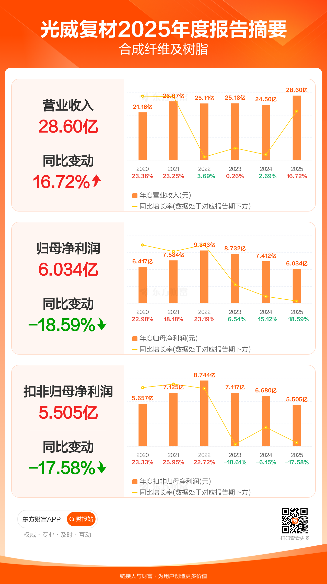 光威复材3月31日发布2025年年报显示,公司全年实现营业收入28.60亿元,同比增长16.72%;归母净利润6.03亿元,同比下滑18.59%;扣非归母净利润5.51亿元,同比下滑17.58%。