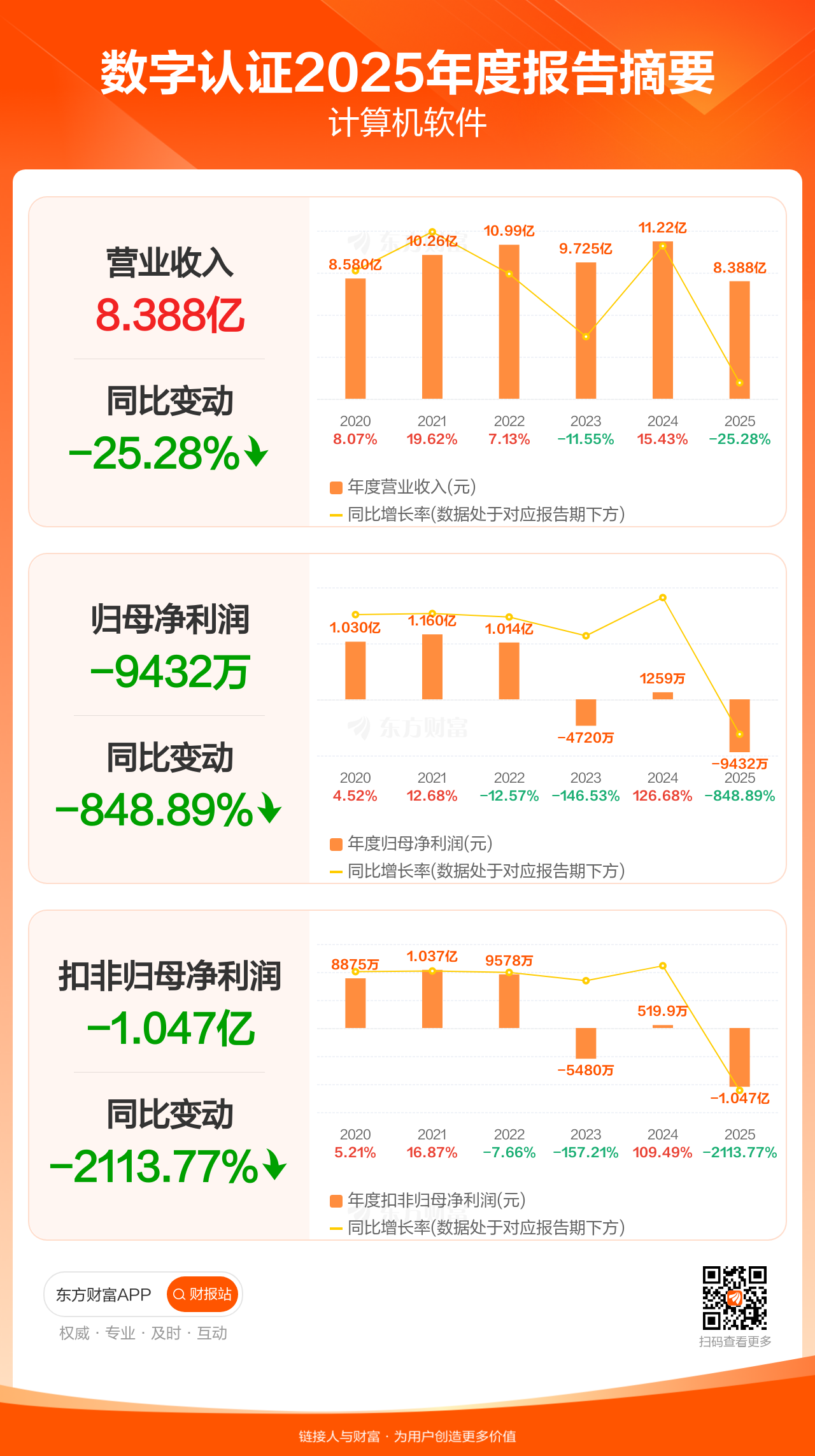 数字认证3月31日发布2025年年报显示,公司全年实现营业收入8.39亿元,同比下滑25.28%;归母净利润-9431.51万元;扣非归母净利润-1.05亿元。