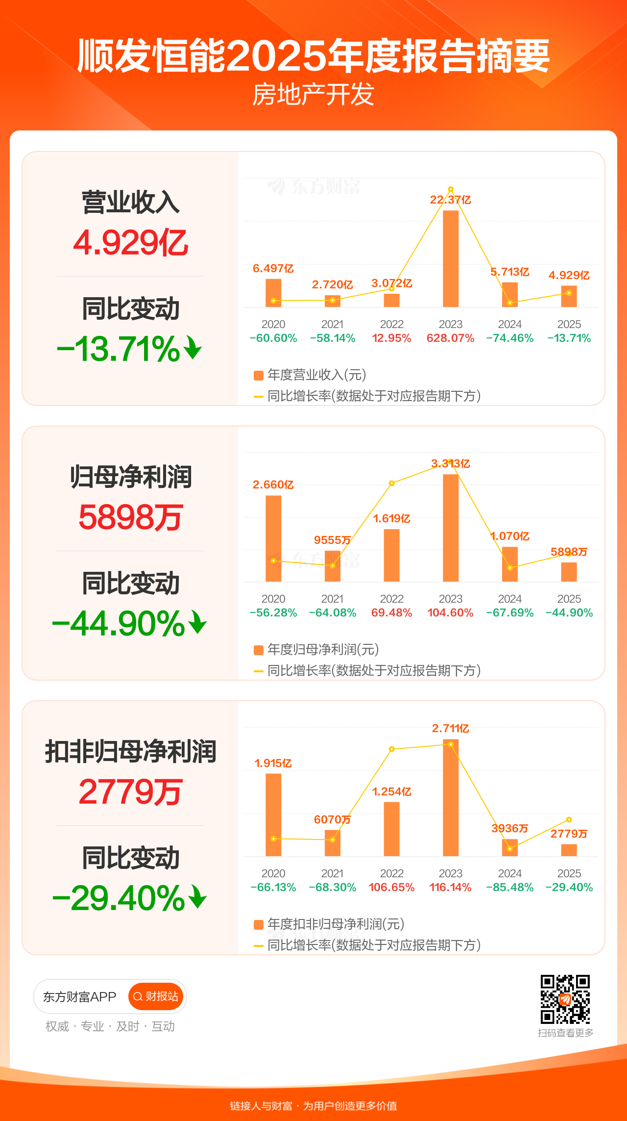 顺发恒能3月31日发布2025年年报显示,公司全年实现营业收入4.93亿元,同比下滑13.71%;归母净利润5897.71万元,同比下滑44.90%;扣非归母净利润2778.81万元,同比下滑29.40%。